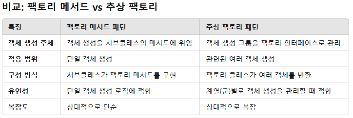팩토리 매서드과 추상 팩토리 패턴이 있는데 팩토리 매서드는 팩토리 클래스, 추상 팩토리는 클래스 내부의 구성을 통해서 객체를 생성하도록 위임함