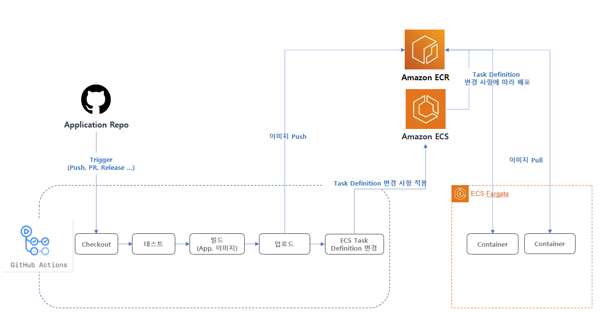 어떻게해야하나 찾아보니까... GitHub Actions에서 ECS용 워크플로우를 만들어놔서 ArgoCD보다 더 쉽게 CI/CD를 구축할 수 있었다. 원리는 Task Definition에 명시해둔 이미지 이름을 변경하고 Task를 재실행시켜서 재배포하는 방식이다.