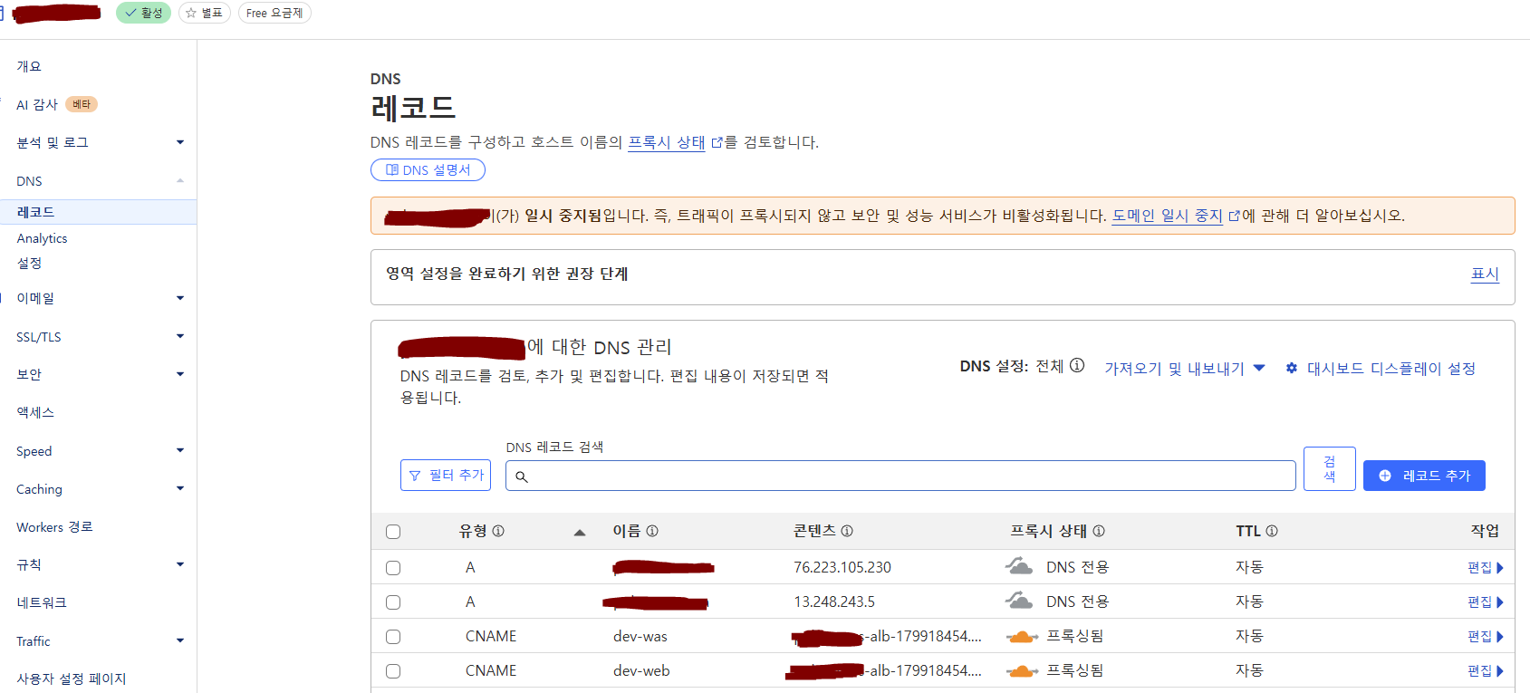 cloudflare 설정 일시중지 혹은 삭제하기