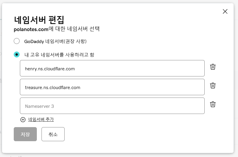 도메인에서 DNS 탭 > 네임 서버 > 네임서버를 변경 버튼을 클릭하면 아래와 같은 창이 나온다.