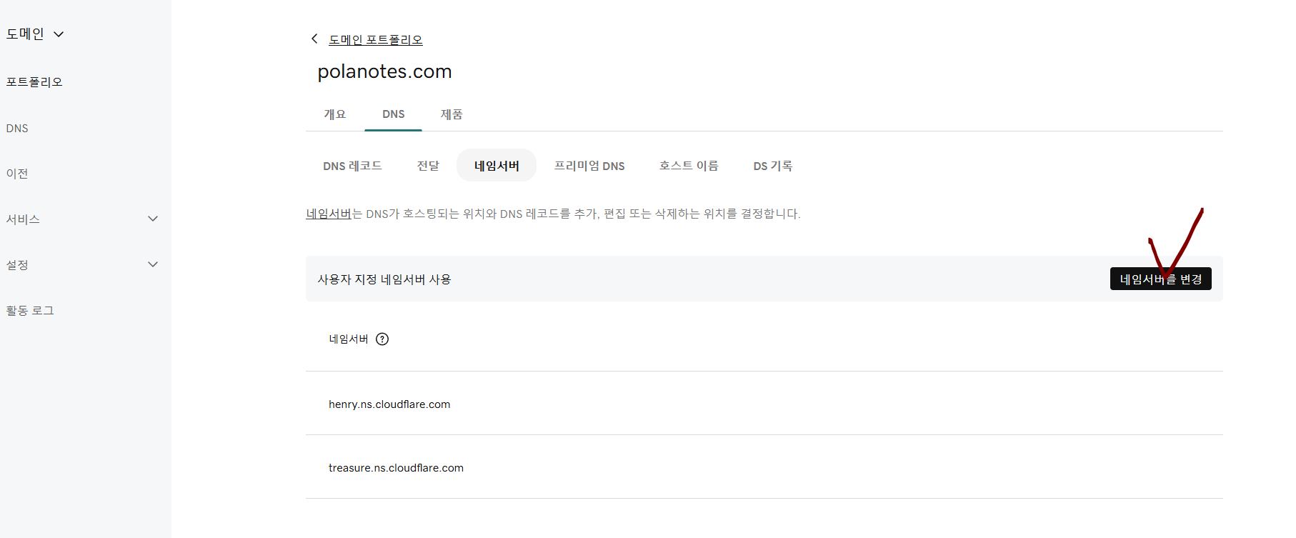 만들어 둔 프로젝트에 레코드를 가보면 하단에 네임 서버가 있다. henry.ns.cloudflare.com, treasure.ns.cloudflare.com이 두 네임 서버를 기억해두자. 사람이 명명한 이름 같지만 클라우드 플레어에서 임의로 만들어주는 네임서버다.