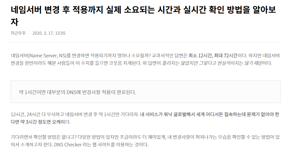 선생님 3시간이라뇨... 저는 12시간도 넘게 걸렸습니다. 정확히는 출근하자마자 작업한 네임 서버 변경이 12시간이 지나도 됐다 안됐다했다. 다음날 출근해서 확인하니까 기존 네임서버로 더이상 넘어가는 케이스가 없는 것으로 확인됐다. 내가 할 수 있는건 그냥 기다려보세요라고 말하는 것 밖에 없었다.