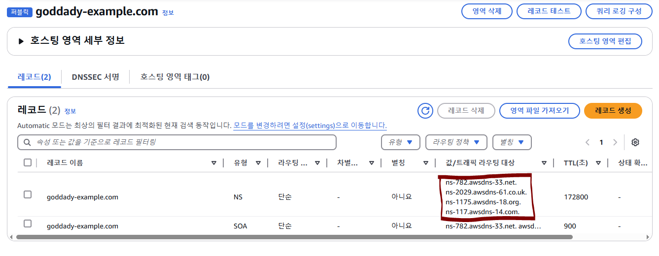 GoDaddy에서 발급받은 도메인 이름을 호스팅 영역으로 지정하고 aws dns 이름들을 복사해두자