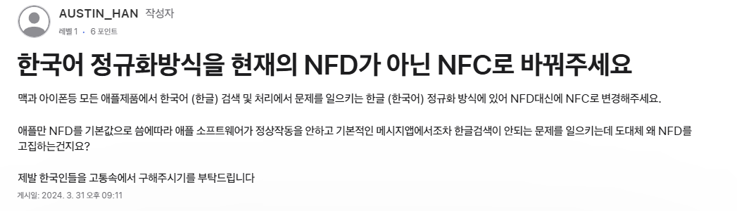 나는 처음 겪는 문제였는데, 오래전부터 iOS 유저들이 겪었던 문제였나보다.. NFD NFC를 검색해보면 구글 디벨로퍼 사이트에 올라온 글이 가장 먼저 뜬다.