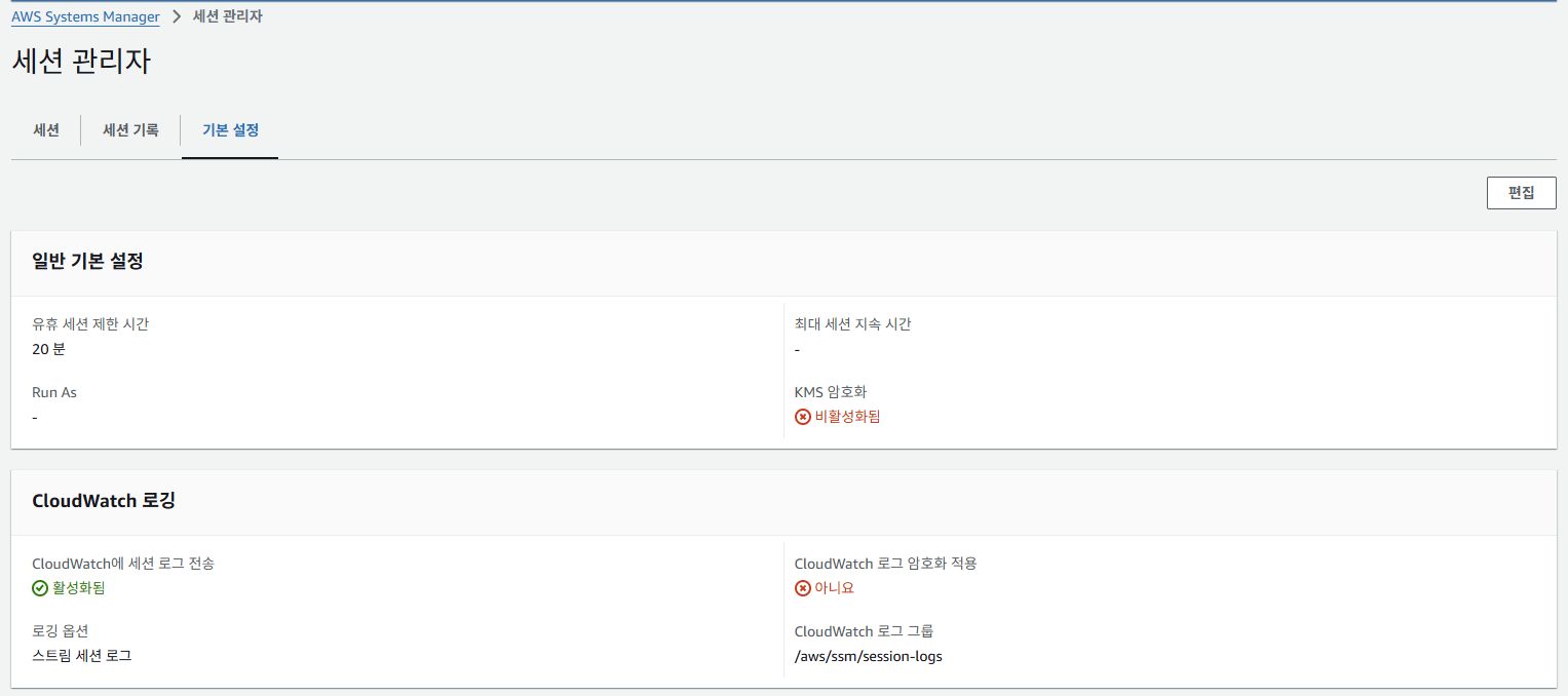 AWS Systems Manager > 세션 관리자 > 기본 설정 탭에서 위에서 만든 session-logs 로그 그룹을 등록해준다. 그러면 로그가 잘 나온다고 한다.