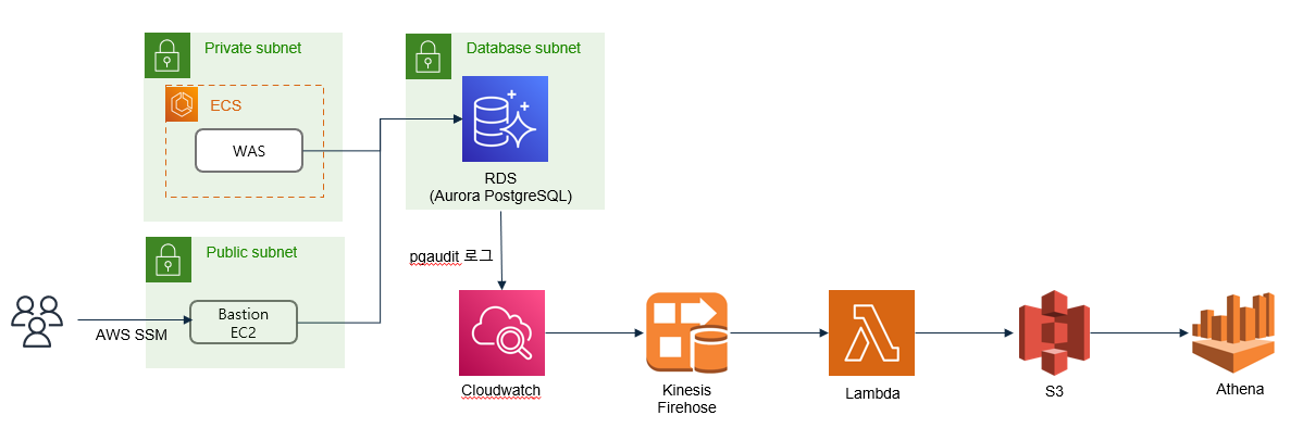 파라미터 그룹에 있는 옵션인 pgAudit을 이용하는 방식인데, 이러면 모든 사용자가 데이터베이스로 요청한 쿼리를 자동 저장 할 수 있다. 여기서 끝났으면 좋았겠지만, 비용 최적화를 위해 몇 가지 단계를 거쳐야한다.