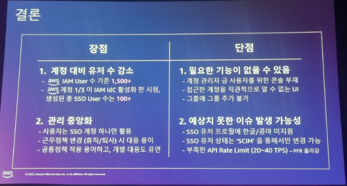 그런데 Identity Center의 Rate limit 때문에 문제가 됐다. 초당 20건으로는 넥슨의 개발자가 너무 많아서 감당이 안됨. AWS 서포트에게 연락해서 두배로 올렸으나 여전히 부족해서 캐싱을 이용해 처리. 아키텍터 분이 콘솔쪽엔 제한이 많다고 했다. 특히 매니지먼트 쪽 TPS는 AWS가 제한을 해둔다..고 한다.