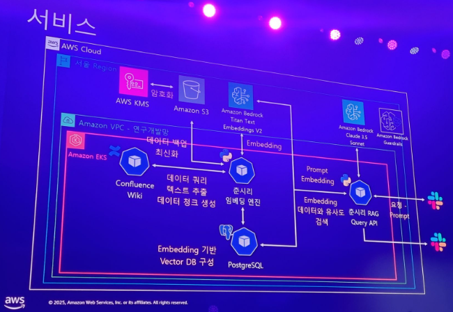 전체 인프라자체는 특이하진 않은거 같은데 vector db를 포스트그레를 이용한게 조금 독특했다. 많이 사용하는 openAI API를 이용한게 아니라 bedrock을 이용한 것도 특이했던 것 같다. 임베딩 엔진은 20분마다 스케줄러를 돌렸다고 한다.