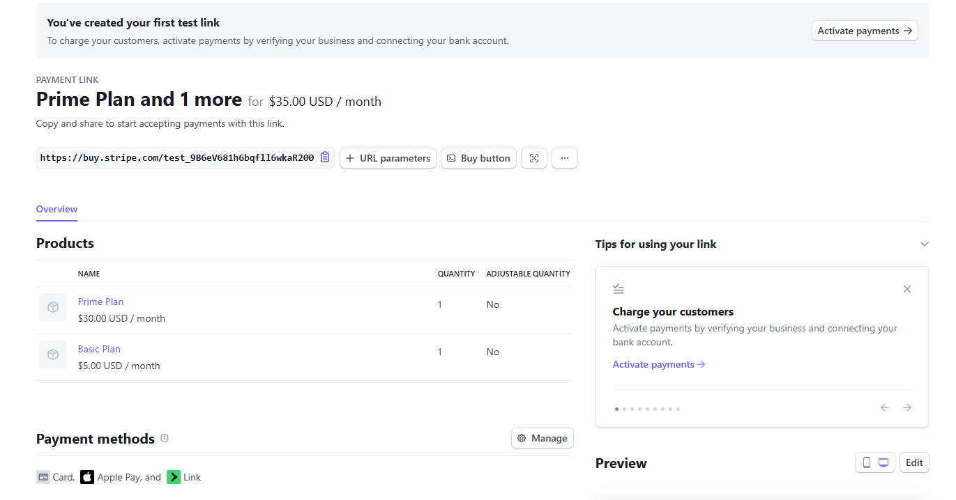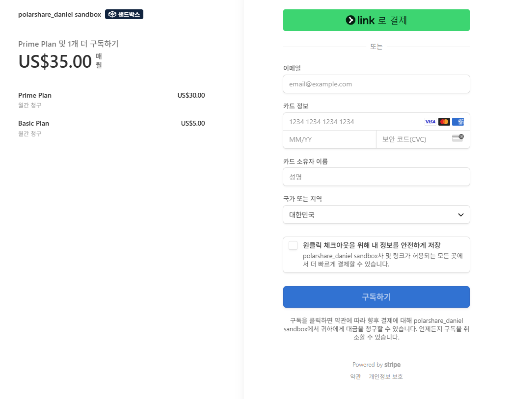 여기까지 만든 후 좌측 탭에 Payment Links로 가서 이 플랜을 등록 후 링크를 만들면 된다.