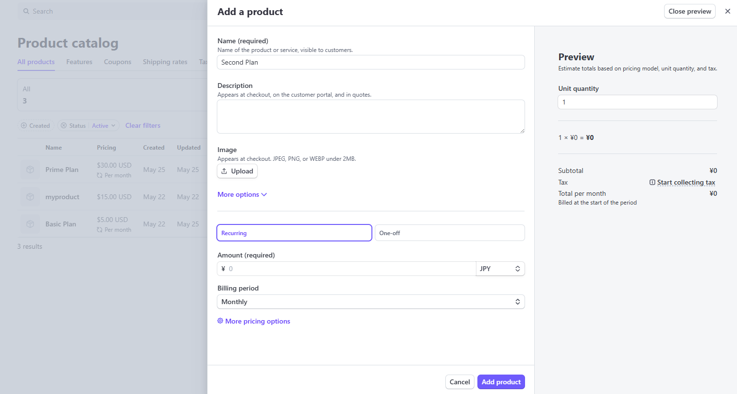 샌드박스 사이트에서 Product catalog > Create Product > Recurring > Billing period(월간 결제면 Montly)를 선택하면 된다.