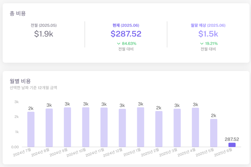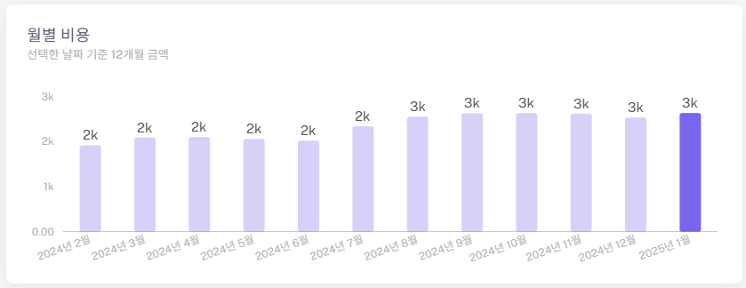 월별 비용 그래프를 보면, 2024년 6~7월부터 인프라 비용이 급격히 상승했다. 이는 당시 새롭게 추가된 기능이 고성능 EC2 인스턴스를 필요로 했기 때문이다. 개발 초기부터 비용 증가가 예상되었고, 이를 Lambda 기반으로 구축하자고 제안했지만, 팀 내에 Lambda에 익숙한 인원이 없어 결국 EC2로 구현하게 되었다.