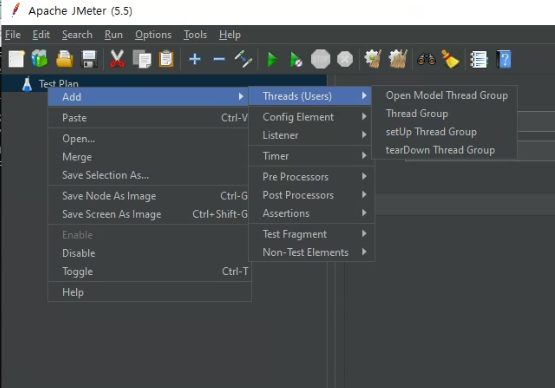 - Jmeter가 켜지면 TestPlan을 우클릭 하고 Add > Threads (Users) > Thread Group