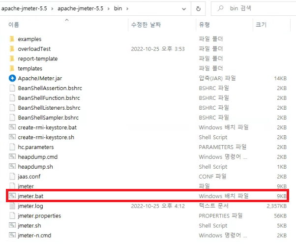 - apache-jemeter-5.5 폴더 안의 bin 폴더로 들어가 .bat 파일 실행