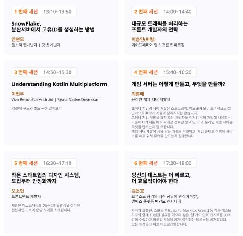 가장 많이 도움될만한 세션 1번과 6번일 것 같고, 2,4번도 재밌을 것 같다. 3,5번은 사실 큰 도움이 될 것 같진 않지만, 한번쯤 들어볼만하지 않을까? 란 기대를 하고 있다.