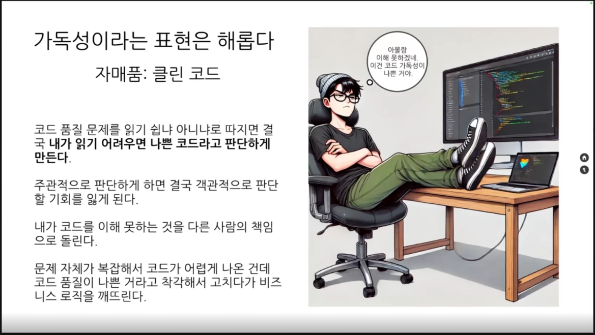 그런데, 코드를 많이 보면서 느꼈던 건 가독성이란게 혹시 그냥 내가 보기 좋은 코드를 말하는게 아닐까? 라는 생각을 하게 됐다.