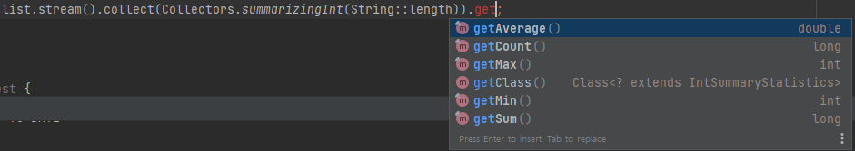 평균, 합산, stream 요소의 갯수, 최대값, 최소값을 return 해준다. 별다르게 설명할 내용이 없다. 대부분 쿼리에서 처리해 줄 수 있는 정보다.