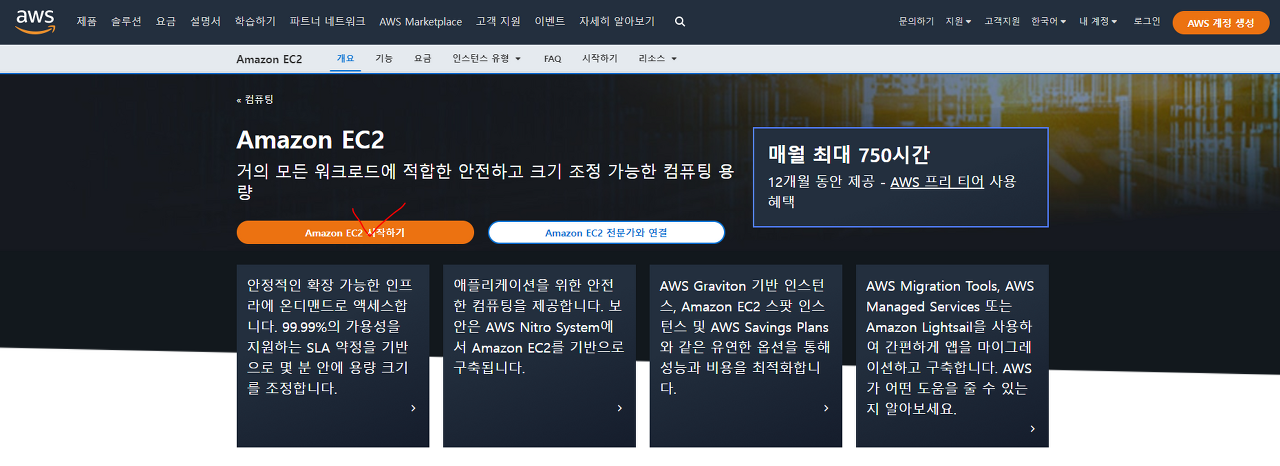https://aws.amazon.com/ko/ec2/ 로 이동한다.
