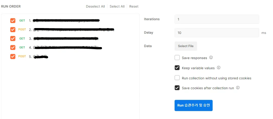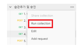 - 요청하려는 순서대로 추가하고, 오른쪽 상단의 햄버거 버튼의 Run collection 클릭