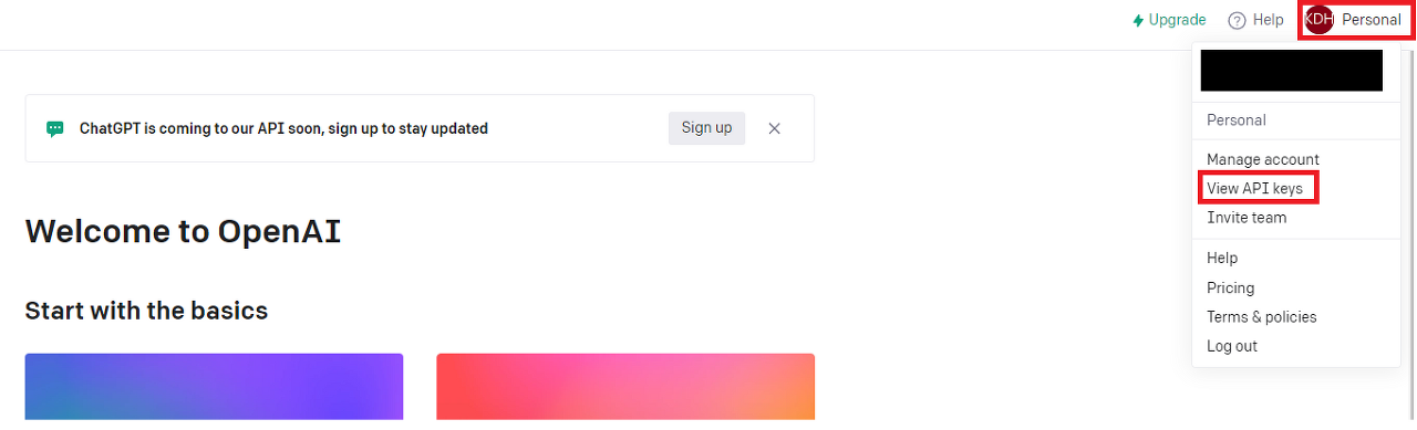 로그인 후 우측 상단의 Personal을 클릭하면 아래와 같은 메뉴가 나오는데 View API keys를 클릭한다.