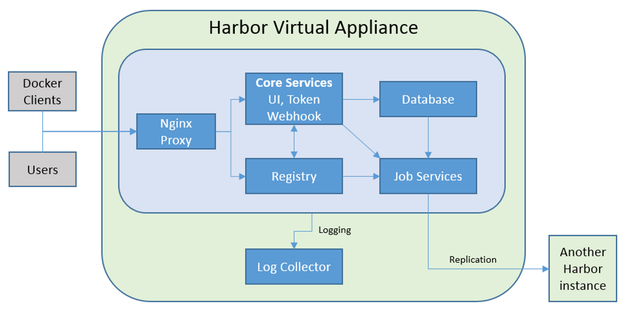 nginx가 harbor의 리버스 프록시 역할을 하기 때문에 요청을 받은 후, harbor 엔진 내부 core, portal 등의 component로 요청을 전달한다.