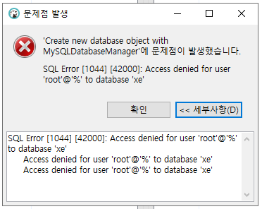 분명 루트로 접속했는데, 테이블 생성부터 아무것도 안된다. 그냥 권한이 없다는 에러메시지만 반복된다.