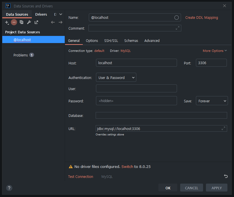 위와 같은 창이 뜨는데 미리 설정해둔 정보들을 넣고 Test Connection을 눌러본다.