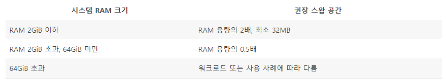 AWS 가이드에는 스왑 공간은 물리적 RAM의 2배와 동일한 것이 가장 좋고, 스왑 공간이 32MB 이상인 것이 모범 사례라고 한다. 또한 RAM의 크기에 따라 권장 용량이 따로 있다.