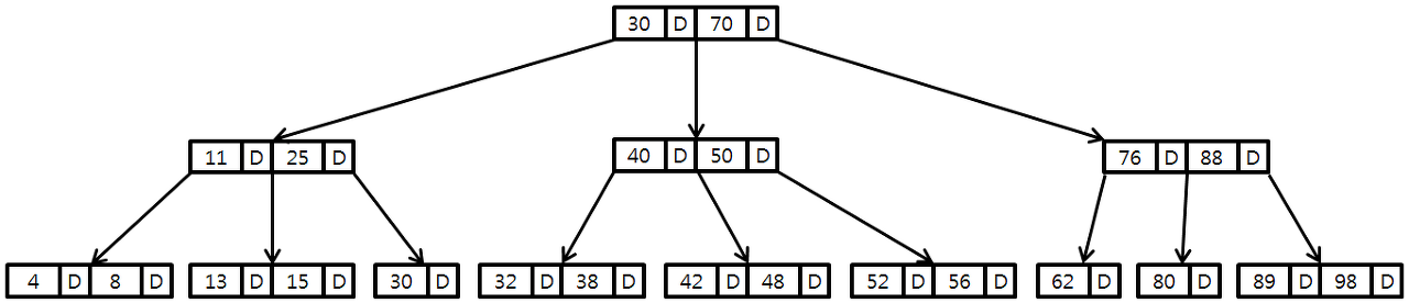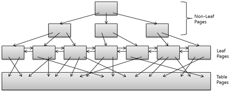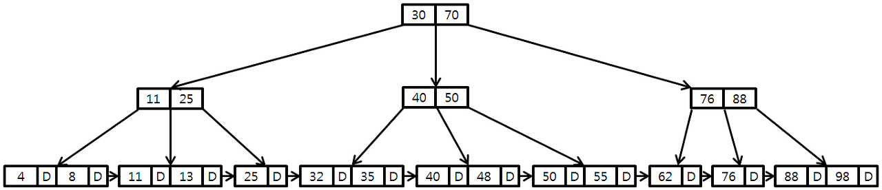 B+-Tree는 B-Tree의 한 종류로서, 일반적인 B-Tree와 달리 데이터 포인터를 리프(Leaf) 노드에만 저장한다. 리프 노드의 상위 레벨인 비리프(Non-Leaf) 노드는 전형적인 B-Tree 로 구성되며 리프 노드를 빠르게 찾는 인덱스 역할을 한다. 리프 노드에는 키와 키에 대응하는 데이터의 포인터가 저장되어 있다.