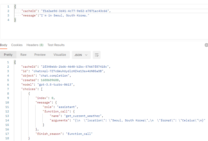 아래와 같이 json 형태의 함수에 맞게 파싱된 json 형태의 데이터가 답변으로 온다.