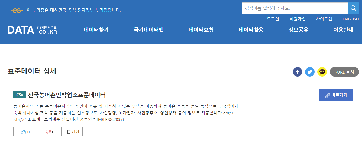 테스트를 위해서 전국농어촌민박업소표준데이터를 가져왔다.
